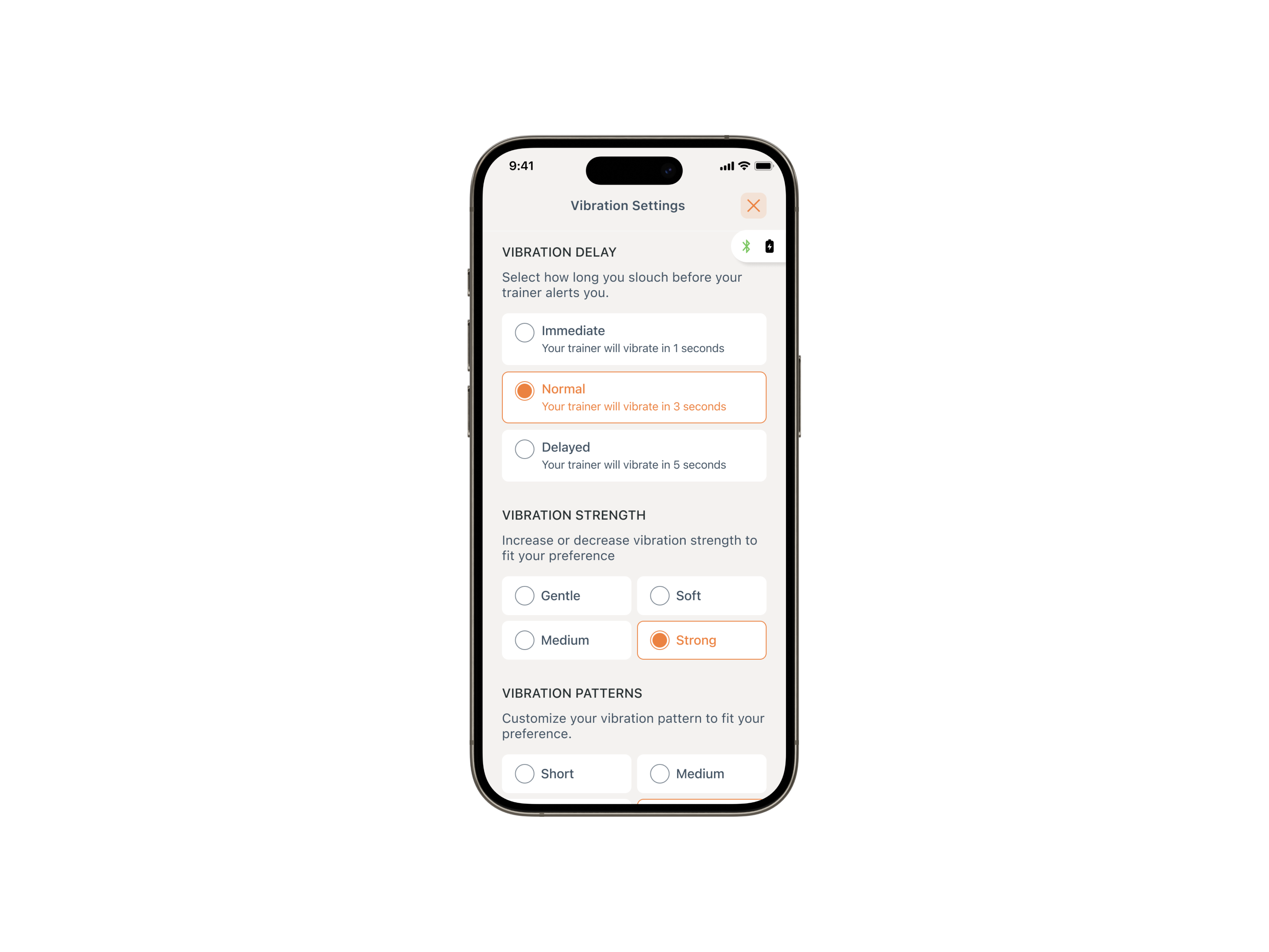 Straight+ puts the power of personalization in your hands. Dive into advanced settings to fine-tune your device to your preferences. Adjust the vibration delay to suit your tolerance, increase or decrease the vibration strength to a comfortable level, and even select from a variety of vibration patterns to find what works best for you. It's not just about improving posture; it's about doing it in a way that's uniquely yours.